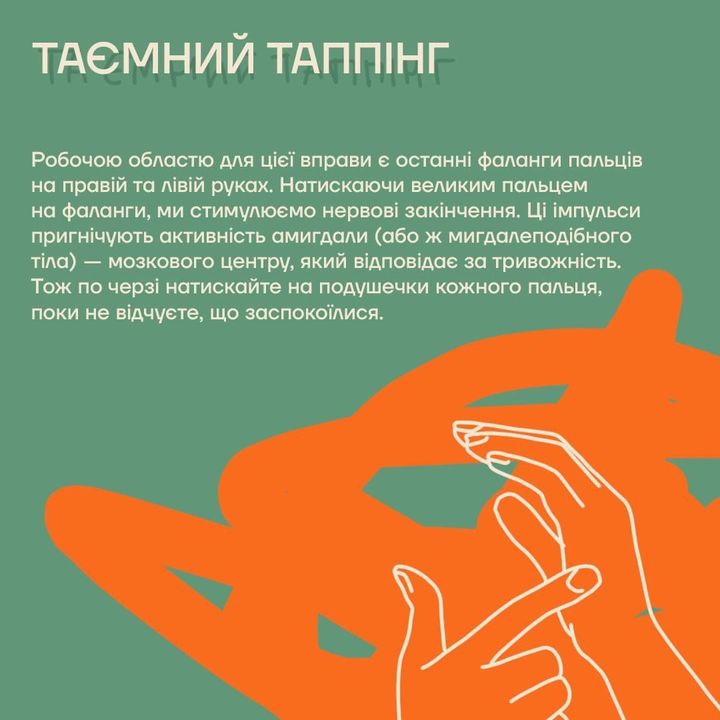 - Складіть руки, наче берете щіпку солі. Три пальці покладіть нижче пупка, а другою рукою простукуйте нижче пупка. Ця практика помічна під час панічних атак і тривог.