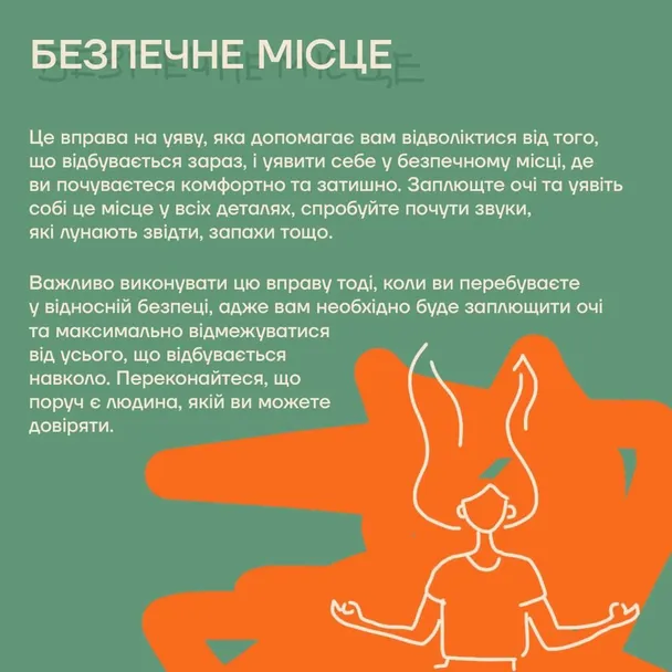 - Стрес, досвід травматизації, переїзд, еміграція позбавляють нас відчуття свого місця. Якщо ми втомлені від стресу, не у своїх домівках, якщо не маємо свого місця ззовні, треба укорінюватися в місці, що всередині нас. Промовляйте вголос такі слова: “Своє місце в тілі займаю. Своє місце поруч зі своїми дітьми займаю. Своє місце поруч зі своїм партнером займаю. Своє місце у своїй сім’ї займаю. Своє місце в домі займаю. Своє місце в реалізації займаю. Своє місце в житті займаю.