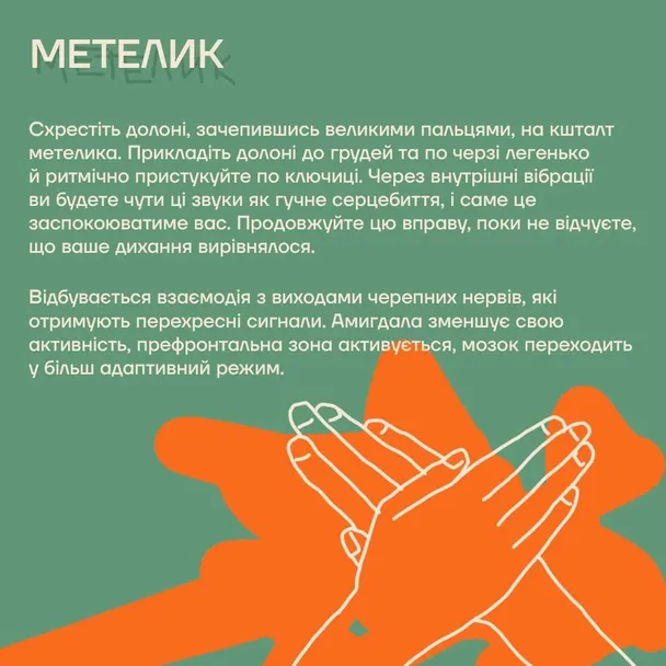 - Вправа “Метелик” або білатеральна стимуляція. Простукуйте грудну клітку, з’єднуючи руки, наче в пташку, з періодичністю один удар на секунду, змінюючи руки. А тепер проговоріть про себе чи вголос: “Я молодець. Я вже стільки-то діб живу в режимі воєнного стану. Я впораюся, ситуація справді складна, але я зроблю це. Я можу бути помічним/-ою для інших людей. Ми точно переможемо”. Можна говорити будь-які позитивні слова.